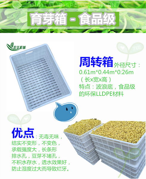 6、豆芽機(jī)結(jié)構(gòu)特點(diǎn)及功能(可根據(jù)客戶需要訂做): 4)周轉(zhuǎn)箱的外徑尺寸:0.61m*0.44m*0.26m(長寬高),特點(diǎn):波浪底,食品級的環(huán)保LLDPE材料,無味,結(jié)實(shí)不變形,不變色,承載強(qiáng)度大,長條形排水孔,豆芽不堵孔,不積水存水,透水效果好,防止?jié)穸冗^大而導(dǎo)致爛牙。