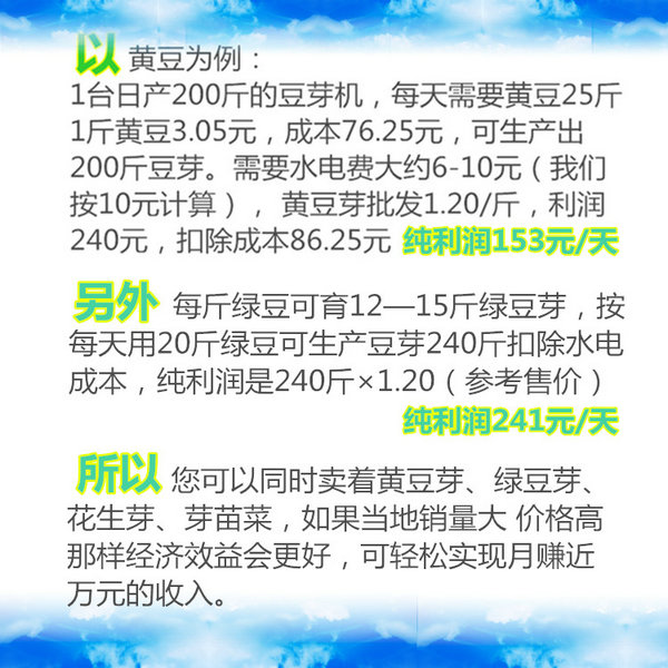 3、豆芽生產(chǎn)流程: 選擇芽豆 →→ 對豆種清洗并做無菌處理 →→ 浸種(適宜水溫) →→ 裝機(jī)(每箱約5斤干豆) →→ 啟動(dòng)豆芽機(jī),設(shè)定合理參數(shù) →→ 對育芽室做無菌處理 →→ 1天后觀察豆芽生長情況 →→ 2天后觀察豆芽生長情況 →→ 3天后觀察豆芽情況 →→ 4天后收獲豆芽 →→ 豆芽清洗后包裝,上市。