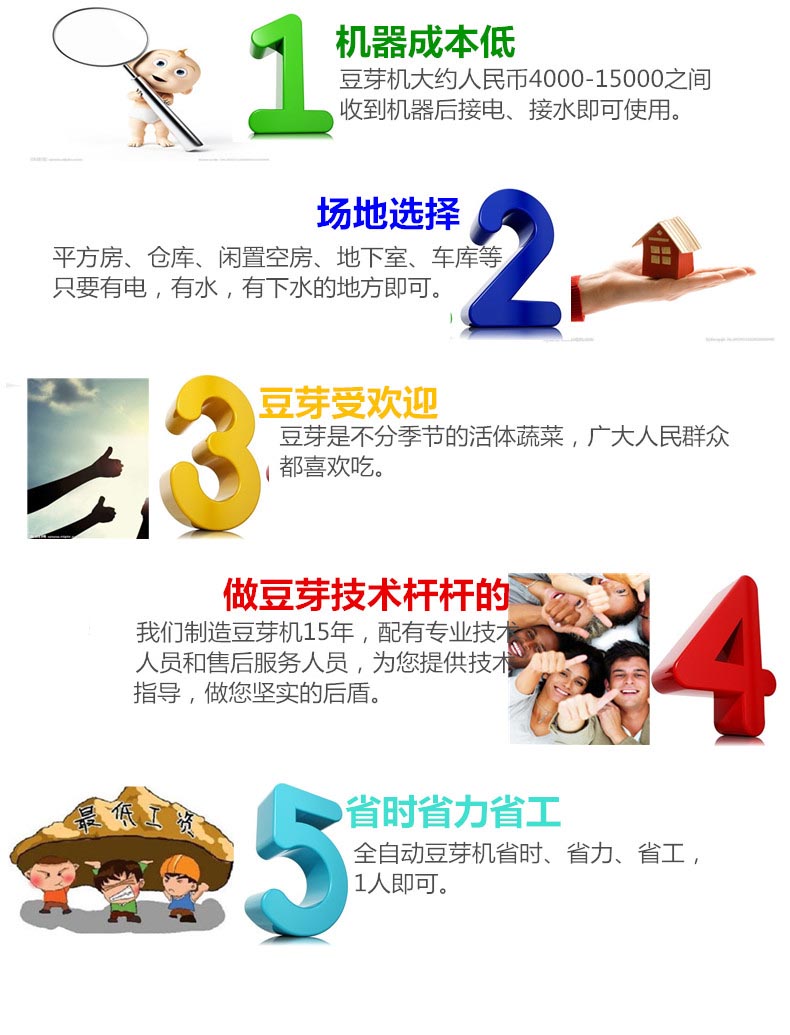 對(duì)來本廠購機(jī)的客戶,我們專車到車站接送,并報(bào)銷一部分來回火車票、汽車票,在本工廠參觀學(xué)習(xí)期間,免費(fèi)提供食宿,我們以“我誠信、你放心”經(jīng)營理念與客戶建立和諧的、共發(fā)展共榮辱的合作關(guān)系,讓我們的產(chǎn)品去說話! 我工廠內(nèi)擁有大型豆芽生產(chǎn)車間,常年生產(chǎn)豆芽和特色芽苗菜,每天出產(chǎn)豆芽4000斤以上,銷往青州孟七農(nóng)貿(mào)市場和各大及學(xué)校食堂,歡迎各界朋友來我處參觀考察,將現(xiàn)場試機(jī)和免費(fèi)培訓(xùn)生產(chǎn)技術(shù)。 工廠內(nèi)大型培育基地,免費(fèi)培訓(xùn)30多種芽苗菜生產(chǎn)技術(shù)!