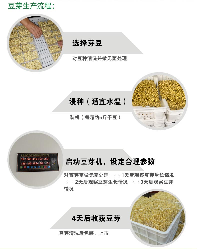 3.豆芽生產(chǎn)流程: 選擇芽豆 →→ 對(duì)豆種清洗并做無菌處理 →→ 浸種(適宜水溫) →→ 裝機(jī)(每箱約5斤干豆) →→ 啟動(dòng)豆芽機(jī),設(shè)定合理參數(shù) →→ 對(duì)育芽室做無菌處理 →→ 1天后觀察豆芽生長情況 →→ 2天后觀察豆芽生長情況 →→ 3天后觀察豆芽情況 →→ 4天后收獲豆芽 →→ 豆芽清洗后包裝,上市。